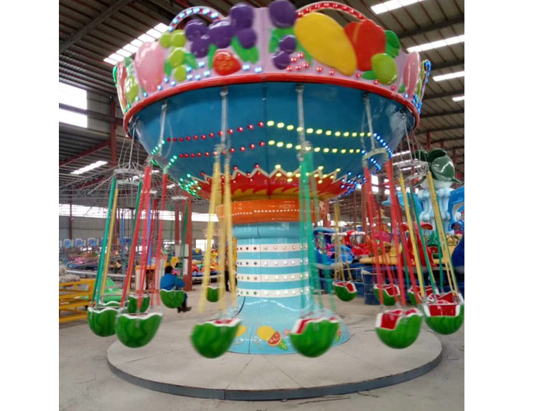 西瓜飛椅是款經(jīng)典的游樂設備。其靚麗的外表和充滿刺激性的游戲形式很受大家的歡迎。外在的水果西瓜造型色彩鮮艷,栩栩如生更是讓人駐足。該兒童游樂設備部飛檐和中心柱玻璃鋼均配有彩燈,在夜幕下更是美輪美奐。乘客乘坐在吊椅上能體驗到飛翔的感覺,收獲快樂! 水果飛椅備配有16個精美的西瓜座艙,整體設計美觀大方,設備周身配有許多燈光,的提升了設備的視覺效果和設備本身的吸引力!